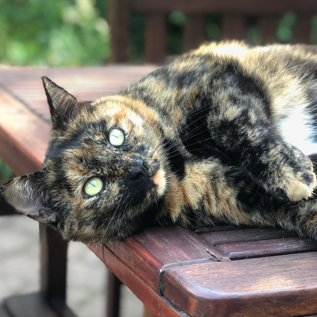 The naughty tortie. A little love bug and very cuddly, but not afraid to sharpen her claws on you. LOVES her food and Chloe. Wishes Monty would be rehomed.🖤